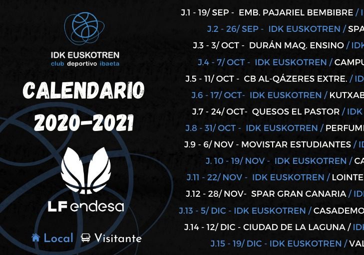 CALENDARIO 2020-2021 Esta mañana se ha dado a conoces el calendario para la temporada 2020-2021. Comenzaremos la primera jornada jugando a domicilio ante el E. Pajariel Bembibre. En la siguiente imagen podreis consultar todas las jornadas. más / gehiago 19 May Azu Muguruza seguirá liderando el proyecto del... 28 Nov IDK EUSKOTREN – CASADEMONT ZARAGOZA (76-67) 17 Jun «Queremos construir un proyecto de club a... 18 Nov Joyce Cousseins-Smith, refuerzo para el puesto de... 26 Mar VALENCIA BASKET – IDK EUSKOTREN (19:00)
